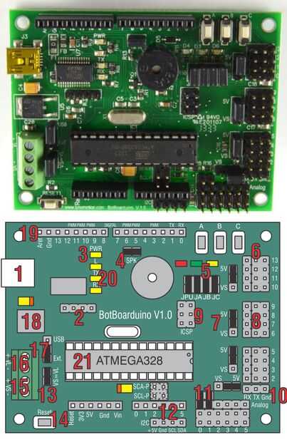 Cuenta con un altavoz incorporado (conectado al pin 5), tres pulsadores a bordo con el correspondiente LED, un botón de reset, separan lógica y servo alimentación entradas, un bus de E/S con 20 pernos y tierra y el poder un 5vdc 1.5amp regulador.