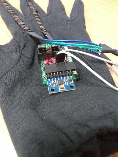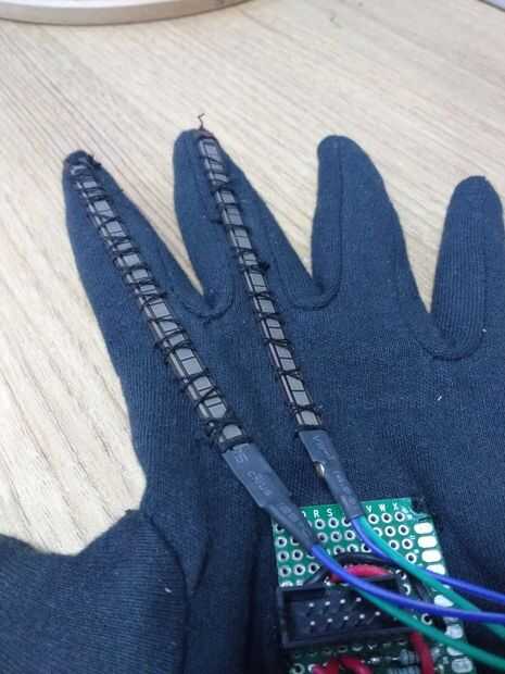 Hemos cosido los sensores de flexión en los dedos primeros y segundo del guante. Un nuevo circuito fue soldado con un PCB de propósito general con los siguientes componentes