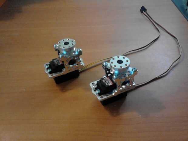 Base: Para la base utilicé una Servocity DDP155 Pan base con un Hitec HS-5485HB servo digital estándar, con rotación de 180 grados. También puede utilizar un servo estándar común de 90 grados para la base. También 2 x Actobotics aluminio canales, 2 x ServoBlocks con eje de centro y 2 x Hitec HS-311 servos estándar para el movimiento.