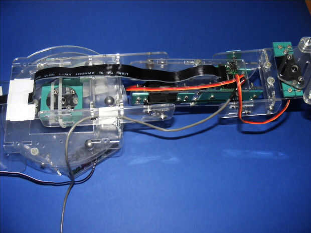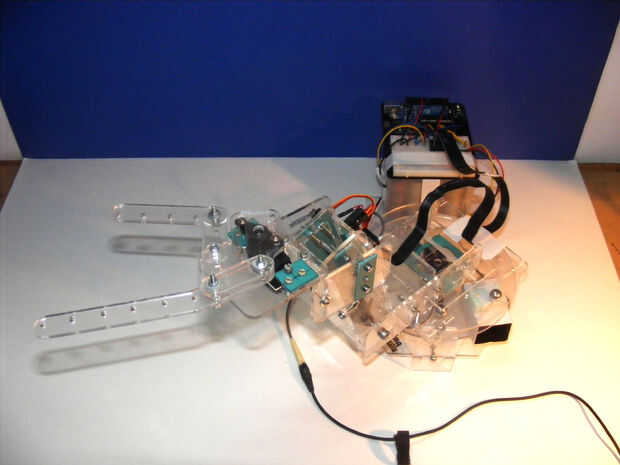 Aunque en el video que publiqué son 4 monitoreo programs(panels), realmente esos 4 son exactamente iguales con sólo una diferencia, el ángulo de visión. Por lo tanto, el brazo robótico es controlado por una plataforma de arduino uno, y con cualquier movimiento que envía a través de TTL(serial-usb) un código específico que es recibido por el programa gráfico de proceso bruja lo analiza y mover el brazo virtual después de uno real.
