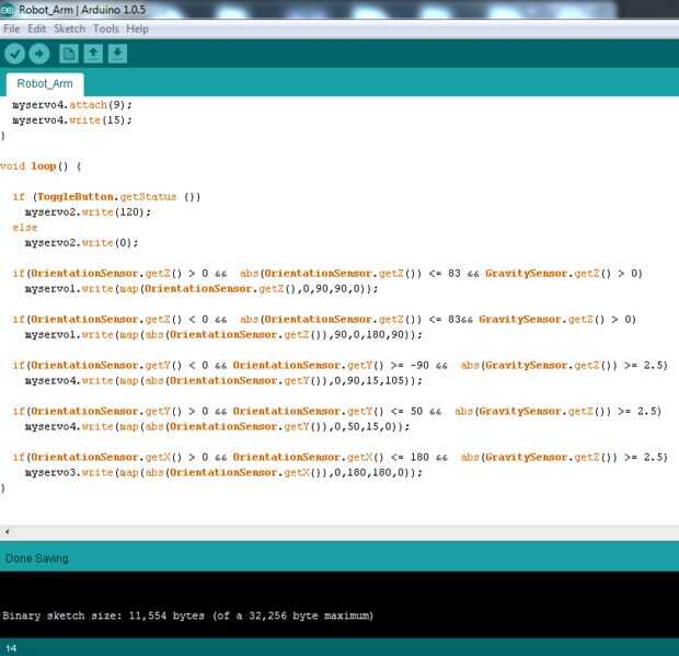#include <OneSheeld.h> #include <Servo.h> Servo myservo1; Servo myservo2; Servo myservo3; Servo myservo4; void setup() { OneSheeld.begin(); myservo1.attach(3); myservo1.write(90); myservo2.attach(5); myservo2.write(0); myservo3.attach(6); myservo3.write(180); myservo4.attach(9); myservo4.write(15); } void loop() { if (ToggleButton.getStatus ()) myservo2.write(120); else myservo2.write(0); if(OrientationSensor.getZ()>0 && abs(OrientationSensor.getZ())<= 83 && GravitySensor.getZ() > 0) myservo1.write(map(OrientationSensor.getZ(),0,90,90,0)); if(OrientationSensor.getZ()<0&& abs(OrientationSensor.getZ()) <= 83&& GravitySensor.getZ() > 0) myservo1.write(map(abs(OrientationSensor.getZ()),90,0,180,90)); if(OrientationSensor.getY() < 0 && OrientationSensor.getY() >= -90 && abs(GravitySensor.getZ()) >= 2.5) myservo4.write(map(abs(OrientationSensor.getY()),0,90,15,105)); if(OrientationSensor.getY() > 0 && OrientationSensor.getY() <= 50 && abs(GravitySensor.getZ()) >= 2.5) myservo4.write(map(abs(OrientationSensor.getY()),0,50,15,0)); if(OrientationSensor.getX() > 0 && OrientationSensor.getX() <= 180 && abs(GravitySensor.getZ()) >= 2.5) myservo3.write(map(abs(OrientationSensor.getX()),0,180,180,0)); }