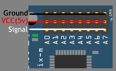 Conexión a la Junta Directiva se realiza con cables de jumper de 3 pines. Cada unidad requiere 1 cable excepto la palanca de mando, requiere 2 cables. Es importante notar donde suelo se encuentra en cada unidad cuando se conecta a la placa. Tierra se nota G en la entrada-salida de RobotGeek.