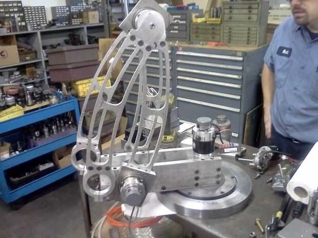 Ahora añadir los componentes del brazo ajuste el enchilada entera excepto el efector final. será pasado. He puesto estas fotos en el orden de montaje que se puede ver el brazo confluyen ahora. Usé 13 5/16 rosca pernos para esto el tiene un montaje al ras para evitar colgar al pasar otras partes durante el movimiento. Los rodamientos montan bellamente. Sobre todo yo estaba muy contento con la Asamblea. Una vez que el brazo fue montado por primera vez que necesitaba para asegurarse de que había libre circulación de todas las partes y nada se estrelló contra unos a otros.