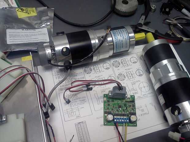 El último elemento que se necesita para tener en cuenta al escoger un sistema de transmisión es no sólo el motor y la transmisión pero el sistema de retroalimentación debe ser abordado. Todos los sistemas de robóticos móvil necesitan retroalimentación si no no se saben donde están en relación con un punto conocido, esto es clave para el control de cada eje. Tengo un codificador de cuadratura de cuenta 5000 en cada eje, esto me da con la reducción del engranaje de 10 a uno sobre 400000 cuentas por revolución del eje, y como ustedes saben la resolución más han en su regeneración lazo más exacto el robot va a ser. Puedes ver los codificadores montados aquí en esta foto que se encuentran en el extremo de cada motor con el tapón gris. Renco hace estos codificadores.