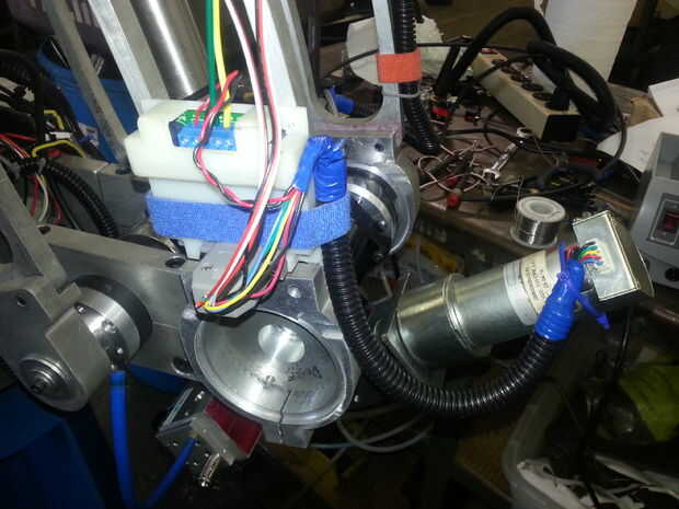 Ahora puede ver el efector final añadido al brazo. También había reelaborado el arnés de cableado para el motor. Energía de tenencia excelente de buena rotación. puedes ver que el último controlador de motor se agrega al final del brazo esto no sólo impulsa el eje 5 pero conduce el solenoide para el efector final.