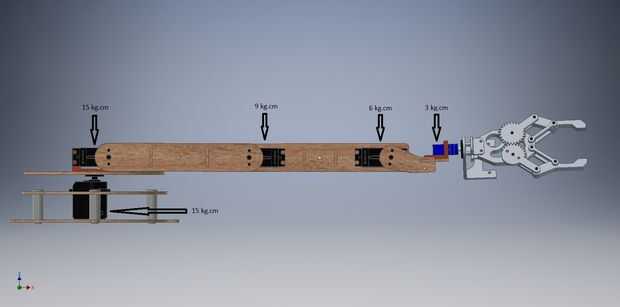 pero en la compra de los motores se encuentra la unidad de esfuerzo de torsión (kg.cm) por lo que la ley utilizada en calcula el esfuerzo de torsión es T=m.L , donde m es la masa de la parte y L es la distancia perpendicular desde el eje de rotación del motor al centro de gravedad del cuerpo.