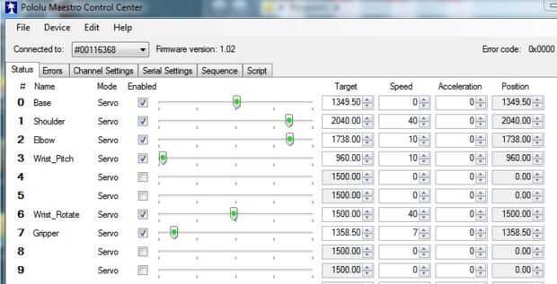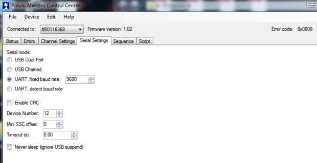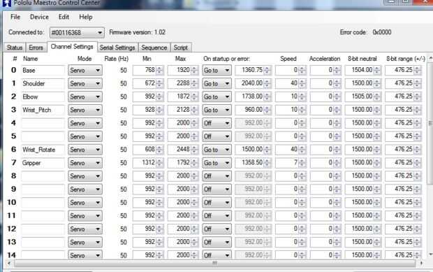 Una vez que tengas esto montado Conecte el servo base con uno de los 12 cables de extensión de servos al canal 0 del Maestro mini y conectarlo con un cable mini-USB a la computadora. Haga doble clic en el icono de centro de Control Maestro y debería conectarse automáticamente a su Maestro mini controlador. En la pestaña de "Estado" panel de control activar canal 0 y centro el servo en 1500 (que por cierto es en micro segundos). Con el servo conectado todavía Inserte el montaje del engranaje en el eje central con la línea de alineación apuntando hacia delante y empuje hacia abajo según las instrucciones proporcionadas. Ahora comienza la diversión.