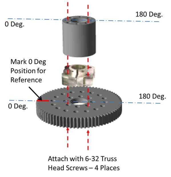 Lo que usted tendrá que hacer es montar el engranaje del eje con el lado liso hacia arriba con 3/4 o 1 pulgada truss 6-32 tornillos. Primer paso es agarrar la abrazadera del tubo que viene con la caja de cambios, el espaciador de cubo y uno de los tornillos para comenzar con. Alinee los agujeros en el espaciador, tubo abrazadera y equipo juntas y coloque las tres piezas en el tornillo. Si no tienes las tres partes bien se terminan con un espacio que no desea. Es bastante fácil fijar por del forro en el tornillo y apriete de nuevo otra vez después de recibir un mejor agarre. Deberás hacerlo en tres lugares. Esto se muestra en la primera foto en este paso.