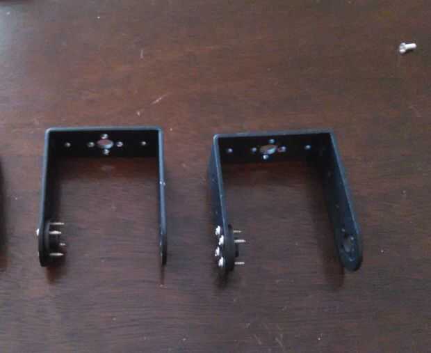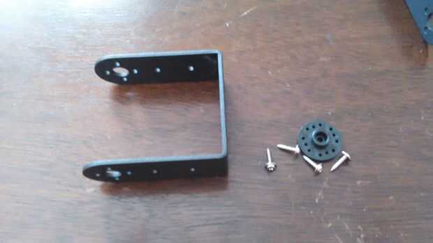 1. se reúnen los dos soportes en forma de U, 2 cuernos servo redondo y 8 tornillos servo.