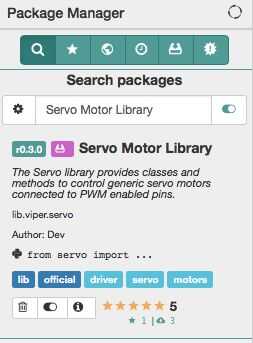 Puedes buscar "Servo Motor biblioteca", y después puede Agregar esta biblioteca a la IDE de Viper. Después de que usted puede utilizar esta biblioteca, en su proyecto, por un comando de línea simple. En la parte superior de su código se puede escribir: