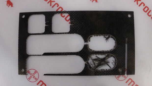 Para las piezas de fibra de carbono placa, hemos utilizado un pequeño CNC de corte que tuvo nuestra escuela en uno de la tecnología de fabricación las aulas. Mecanizado de esta placa de fibra de carbono tomó un peaje en la herramienta de corte y algunos de los bordes eran un poco borrosos y deshilachados, así que había un trabajo de limpieza necesario después de tirar de la máquina. No estábamos sorprendidos totalmente, así que estábamos preparados con grano 250 en la mano.