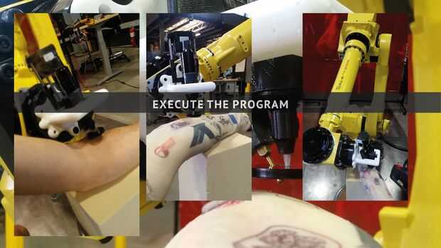 Depuis notre prototipo teatro cessé d'évolué. Nous de Il un permis de tatouer un grand nombre de motivos parfois générés un partir de photo numérique depuis un Ipad, ou de logotipo, ou encore d'illustrations transformées en vectoriales. Toujours dans le pero d'augmenter les possibilités et de pousser encore plus les perspectivas de lomo, nous décidons de changer d'échelle et de réaliser un tatouage un l'aide d ' un bras robot industrial. Pour cette expérience nous utilisons: