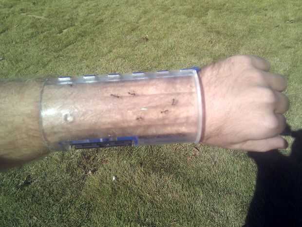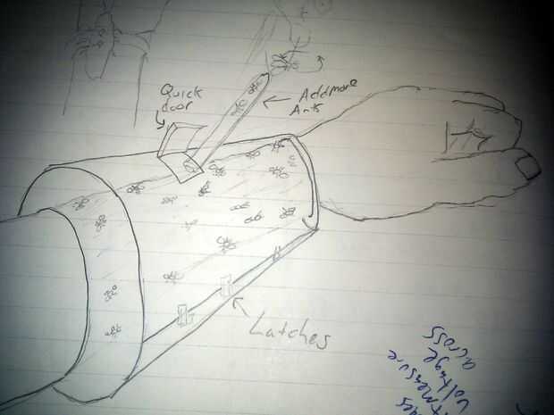 Por esta razón he diseñado la muy primera etapa de lo que estoy doblaje "Brazo-y" Ant farm **. Básicamente se trata de una granja de hormigas que puede llevar directamente en el brazo. Los pelos en el brazo darán constante retroalimentación en cuanto a las acciones minuciosas de tu Colonia y proporcionan un buen substrato de antigravedad para que tus amigos suben alrededor de.