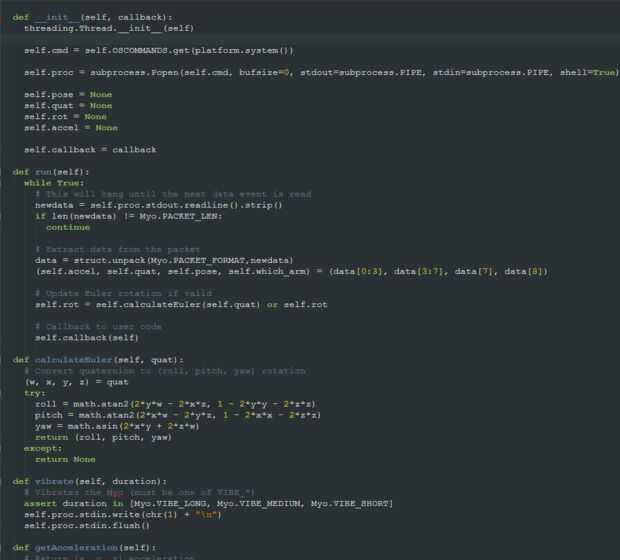 La clase real de Myo (interior myo.py) maneja los datos de salida desde el ejecutable envuelto y hace que sea fácil de usar en un script de python. Tiene métodos para obtener los datos que el mio actualmente permite al usuario acceder a, además de una conveniente conversión de quaternions a roll/pitch/yaw rotación.