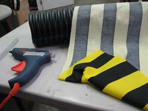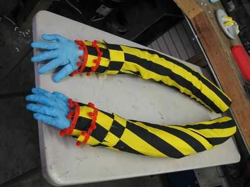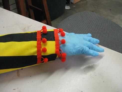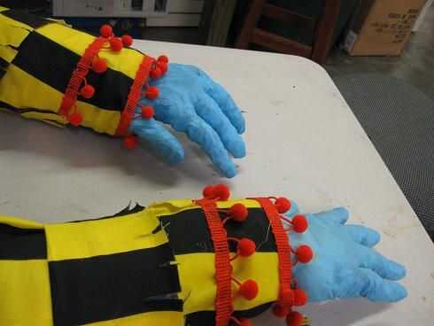 simplemente coloque el material en y alrededor de los brazos, pegar caliente y plegable en su lugar. existe el derecho o mal en hacer esto, especialmente para un payaso... compré como 2 yardas de material y había dejado muy poco.