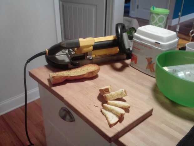 Nos encanta el pan de ajo. Amamos a rodajas finas. No queremos puré, aplastadas, rasgadas, sucias o gruesas rebanadas. La mejor manera de conseguir esponjosas rebanadas uniforme es utilizar un portaband Sierra.