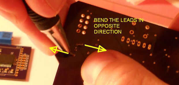 Ahora insertaremos ambas macetas de adornos en el tablero. Doble ambas superior y una inferior lleva pero en dirección opuesta. Esto bloqueará los potenciómetros en el tablero para que no se caen de él cuando nos tapa la Junta a soldar en.