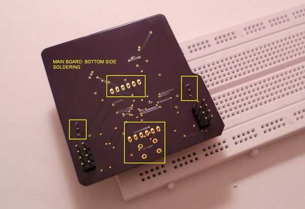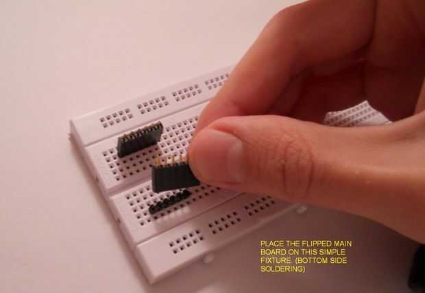 Ambos cabezales de 1 x 6 pin (previamente hechos) Inserte en el protoboard. Coloque ambos receptáculos como se muestra en la imagen. Voltear el tablero principal e insertarlo en el aparato. Verifique que cada pin de ambos recipientes vino a través de la Junta. La soldadura en las ollas de ajuste, interruptor táctil y recipientes.
