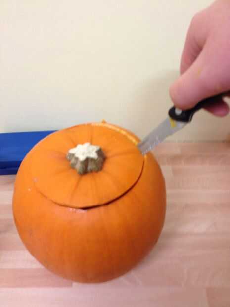 Simplemente cortar un círculo en la parte superior o la calabaza para tener acceso al interior y empieza a sacar con pala hacia fuera las entrañas