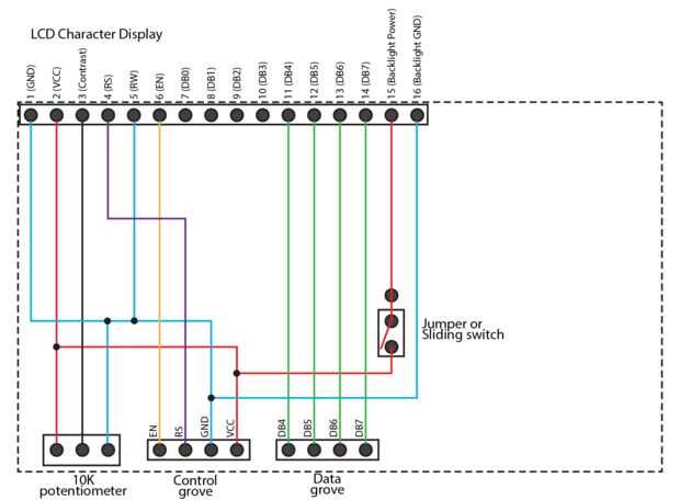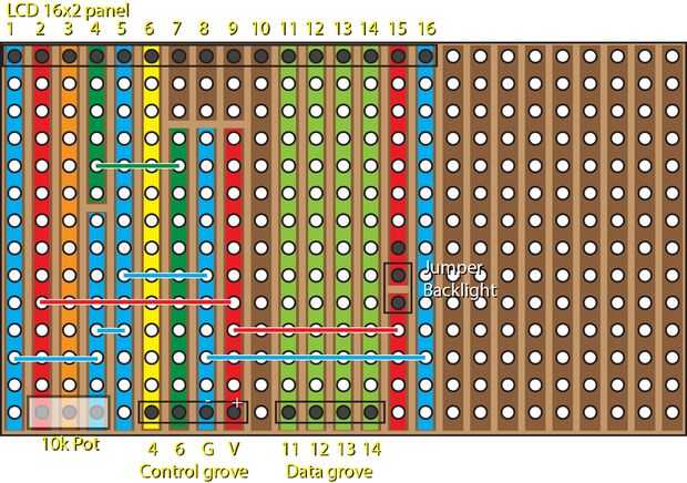 Generalmente de diseño mis prototipos usando Proteus, pero esta vez he utilizado Illustrator para el diseño de la Junta de vero. Illustrator, me permite utilizar colores de fácil legibilidad. Por favor vea las dos primeras ilustraciones. El diseño es bastante simple. Tenía la intención de utilizar 4 pines de datos del LCD (DB4 a DB7). Pines RS y EN también necesitan estar conectado a la MCU. Además LCD requiere 2 sets de VCC/GND, uno para accionar para arriba, otros para iluminación posterior. He utilizado un puente en la línea VCC de luz de fondo, por lo que puedo hacer contraluces ON y OFF. Un interruptor deslizante sería más conveniente (pero no tengo uno); un interruptor momentáneo (botón pulsador) puede utilizarse en lugar de otro para momentáneamente encendió cuando usted lo necesita.