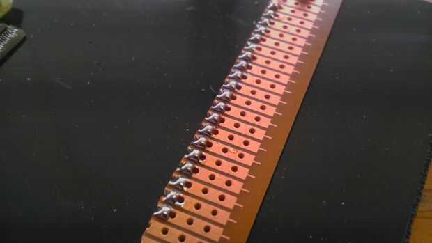 Así que esta es la salida de la tarjeta de arranque. Para esto usé algunos pelado proto-tablero estándar cortar dos tiras finas. El revestimiento final del IC han sido estañada y un poco de extra de la soldadura izquierda en. Esto hace el proceso más tarde mucho más fácil.