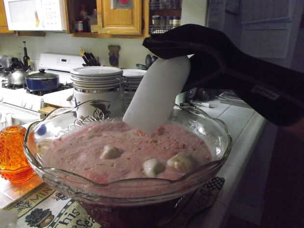 El paso final es la adición de hielo seco.  Asegúrese de usar guantes cuando se agrega el hielo seco.  Usted necesita tener cuidado de agregar el hielo seco, porque el hielo puede darle una quemadura química si entra en contacto con la piel.   Poner grandes trozos de hielo seco para asegurarse de que nadie pone a algunos en su copa por error y asegúrese de personas gastadas sobre el peligro de hielo seco. Una vez que el hielo seco se agrega que el punzón comenzará a burbujear y hacer anillos de humo. Mantenga el hielo seco en un congelador cuando no esté en uso.