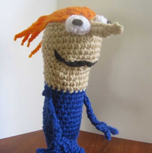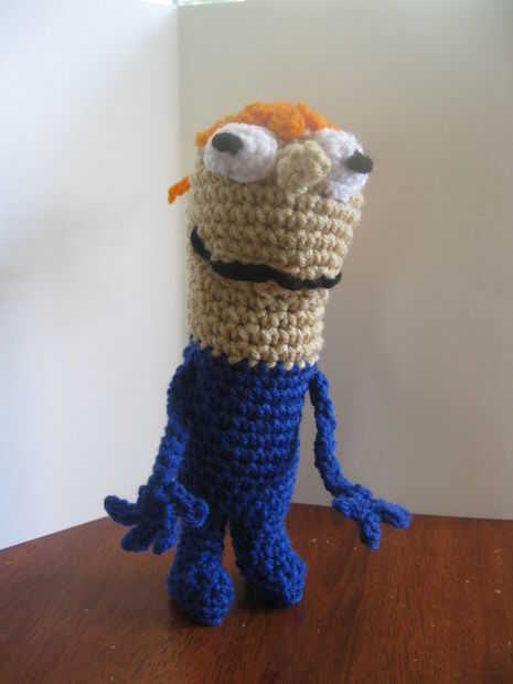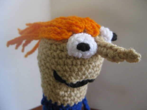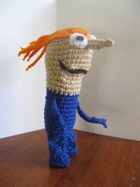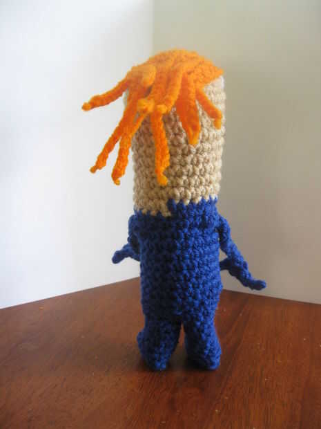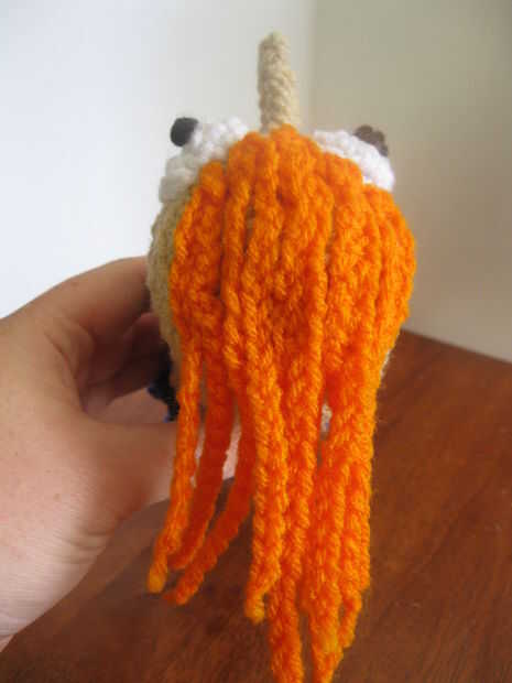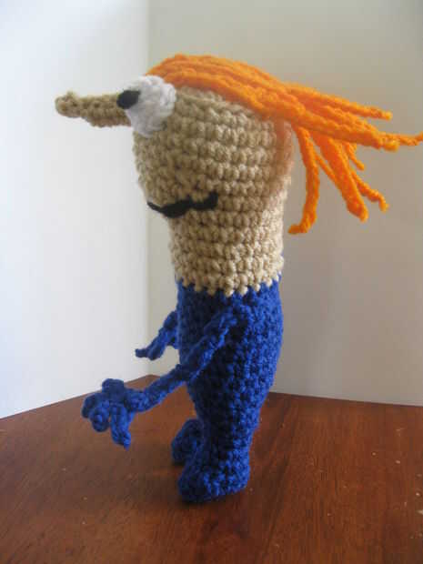 Totalmente es hecha de hilo y relleno de fiberfill. El pelo es cadena de ganchillo y cosidas a la cabeza. Los ojos, nariz y brazos fueron hechos por separado y cosidos en.  Los alumnos son nudos franceses, y la sonrisa bordada en.