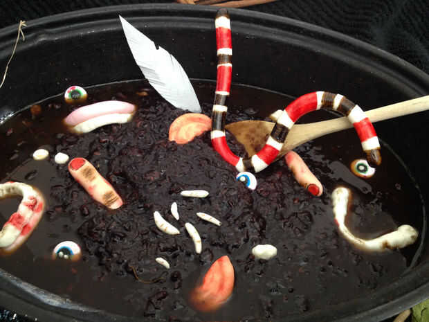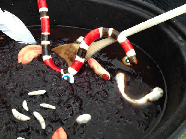 Pour cocido alubias rojas tiernas y su agua en una olla negra (yo uso un asador jaja), top con gachas de arroz, luego coloque la pluma, serpiente, etc. sobre la papilla