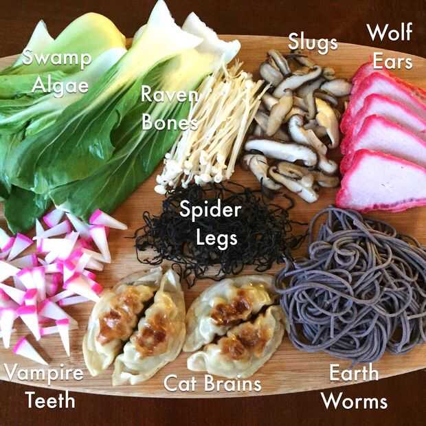 Mi hija seleccionado nuestros ingredientes y temática perfecta para Halloween. Todas las cosas que encontrará en Saimin. Un poco de imaginación y tenía la comida de Halloween perfecta. Sopa de fideos de Brew de las brujas fue un éxito con los kiddos.