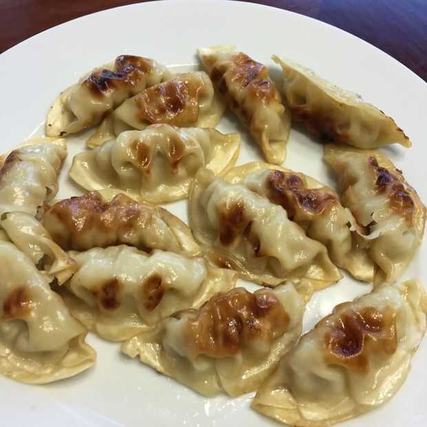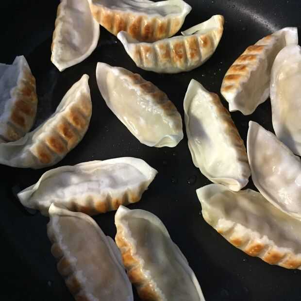 Luego cocine la gyoza. Colocar en una sartén con 1 cucharada de aceite y cocinar hasta que esté dorado, voltear hasta que todos los lados son de color marrón. Añadir 2 cucharadas de agua a la sartén y cubrir hasta que estén cocidas.
