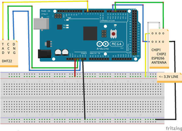 El Serial.begin es para el DHT22, por lo que podría conseguir resultados en el monitor serial antes de el módulo de wifi. El Serial2.begin es para el módulo de wifi. Si está utilizando un Arduino que no sea el Mega entonces puede sólo tiene un serial RX/TX y necesita modificar el código en consecuencia. Ahora instalé el ESP8266.