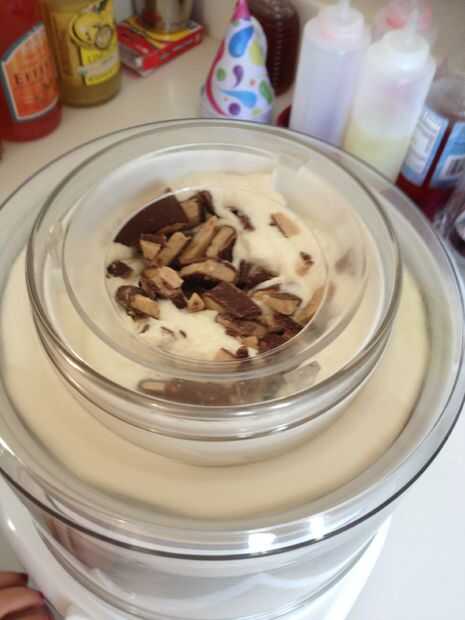 Poner crema mezcla en máquina del helado y mezclar durante 20 min agregar el brezo bares y continúe batiendo por 2 minutos más. Extraer y congelar durante la noche. ¡ Disfrute!