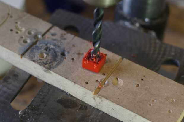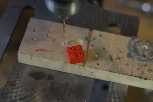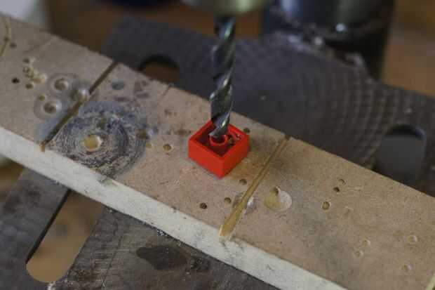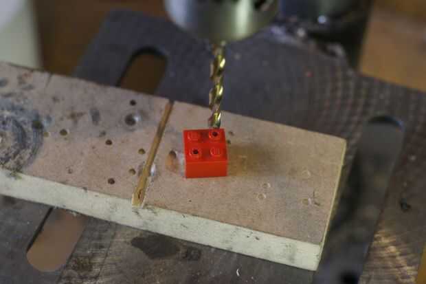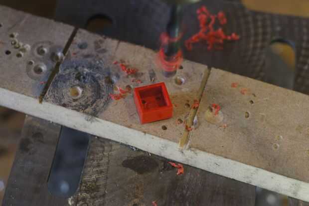 • Como con el ladrillo LED necesitamos perforar un agujero de 2,5 mm en el centro de los postes de madera. Elegimos dos postes frente a la unos a otros. El taladro encuentra su propio camino al taladro desde el interior.