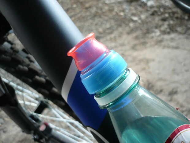 mi largo paseos en bicicleta son más fáciles cuando tengo un montón de agua para beber.  Los jefes de un sostenedor de botella en el tubo del asiento están obstruidos por una bolsa de herramienta especial.  Decidí hacer una botella para colgar de los