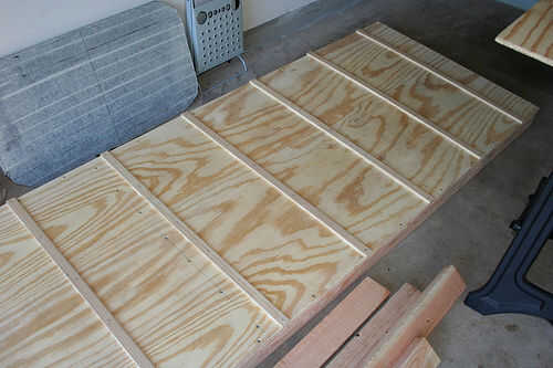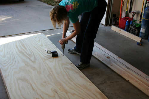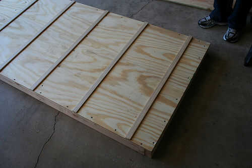 Coloque la hoja de madera contrachapada de 3'x 8' en la parte superior del marco construido sólo. Yo primero perforado, avellanado el agujero a continuación, perforado en un tornillo de la cubierta 2 1/2 en cada orificio. Yo pude han utilizado tornillos pequeños pero esto me permitió usar una caja. Lo hice sobre cada 6 pulgadas o menos.