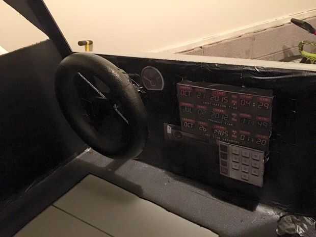 El interior del vehículo puede ser tan simple o complejo como usted quisiera. Opté por simple falta de tiempo. Por lo tanto no construir relojes de tiempo de trabajo real ni condensadores de flujo. En cambio, yo busqué en Google imágenes de estos artículos y les imprime. Usando cajas pintadas de negro, pega estas imágenes en y ducto/pegado con cinta adhesiva en el interior del vehículo.