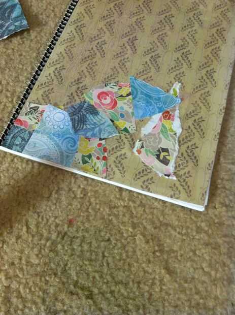 Ahora empezar a pegar el papel rasgado para el cuaderno
