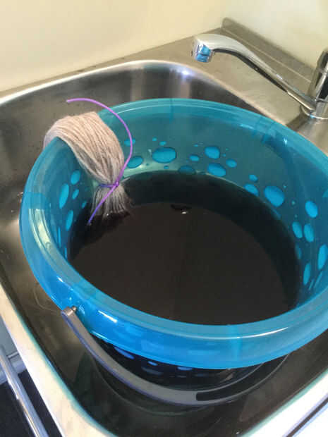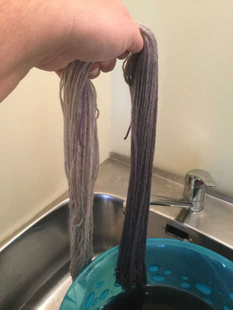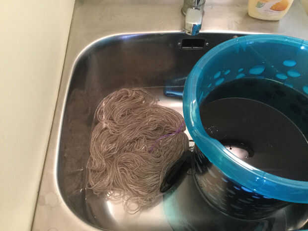 Usando colores claros (como mi gris perla) se necesita permitir que el tinte trabajar más. Unos 25 minutos de remojo sacó un gran color en gris perla. Para tonos más oscuros se necesita menos tiempo. Cuando el hilo es la sombra que desee, sumerja en el agua completamente. Enjuagar la lana. Me gusta utilizar un lavado de la lana en este punto y limpie el exceso de tinte.