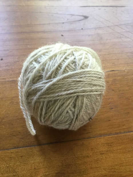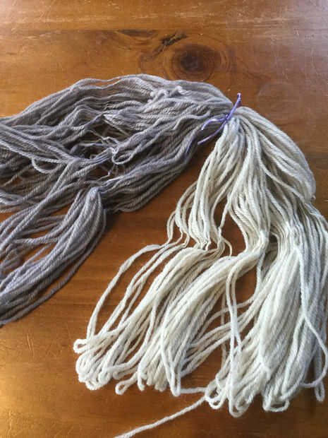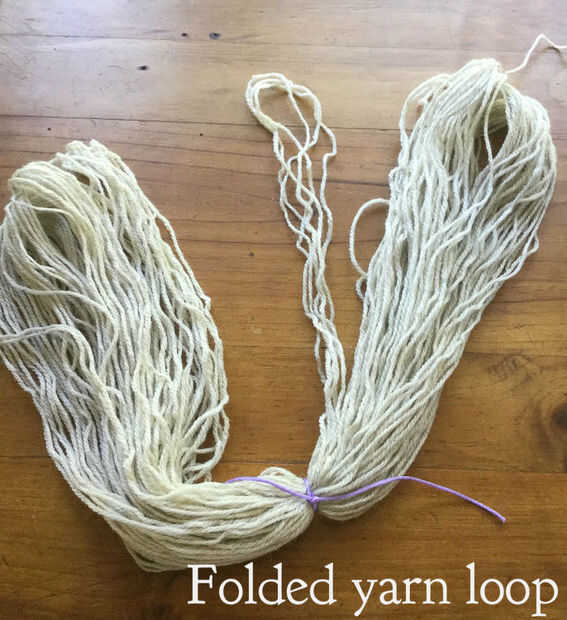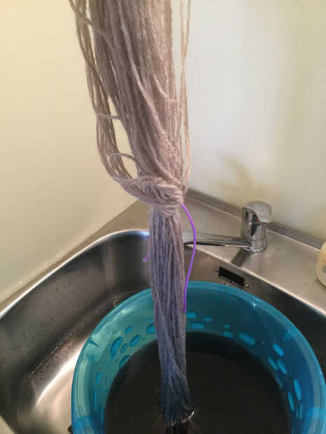 Comience con su bola de hilo. He utilizado 100gms de hilado Southlander en avena. Lo principal es tener un hilo de color claro. Es mucho más fácil de teñir de tonos claros. Enrolla el hilo alrededor de sus brazos (o silla de las piernas, o cualquier otra 2 cosa realmente) en una figura de patrón 8. La longitud de los bucles determinará cuánto tus franjas son.