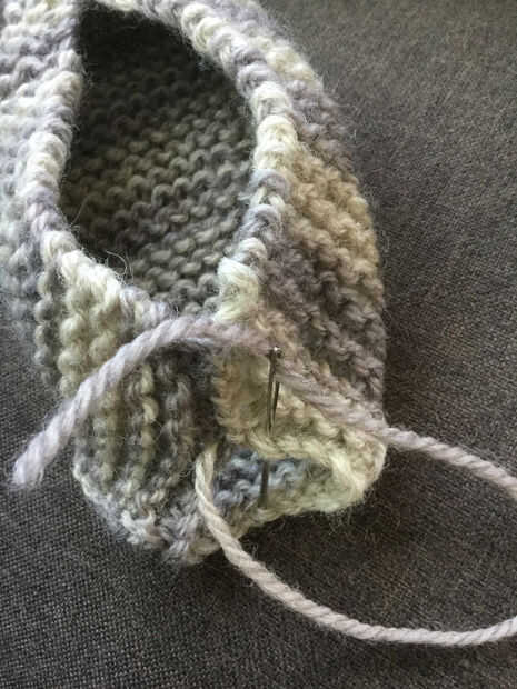 Cortar el hilo con unos 30-35cm en la cola. La cola a través de los restantes puntos del hilo de rosca. Tire firmemente, y puntada hasta la parte superior de la zapatilla como se muestra en la imagen. Con la cola al comienzo, coser la parte trasera del talón como se muestra en la fotografía.