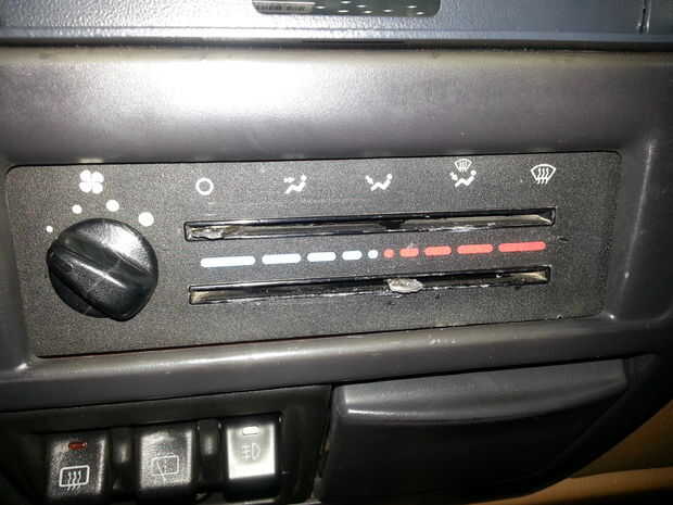 Este es el panel de control de aire acondicionado/calefacción en mi Jeep Wrangler de 1997. Puede observar que faltan las perillas de los controles deslizantes.