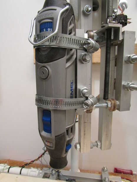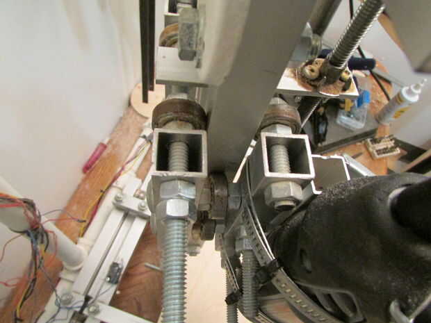 El huso se une con el eje Z mediante las abrazaderas de manguera de impulsión del tornillo. El huso se acuña entre 4 pernos que se usan para fijar los rodamientos a los bloques de rodamiento.