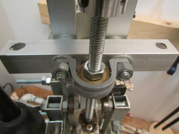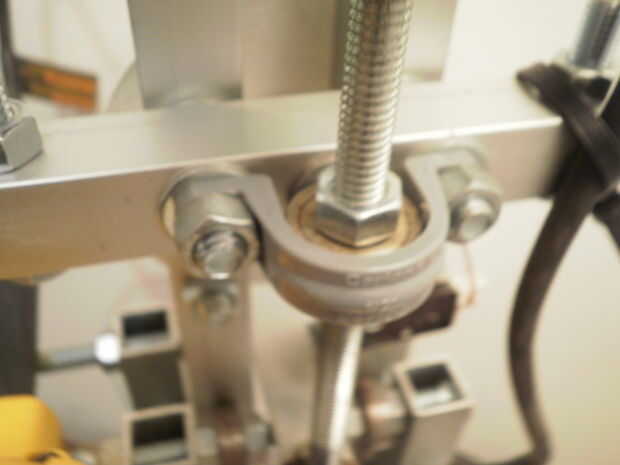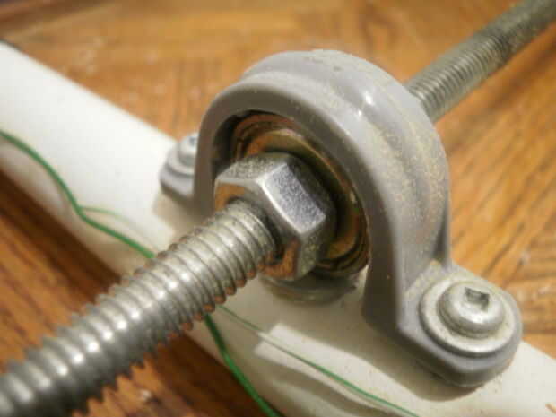 Los rodamientos se sujetan por ambos lados con tuercas. Los rodamientos están fijados al chasis con abrazaderas de conducto de 1/2". Con un poco de presentación, se ajustan perfectamente sobre los rodamientos.