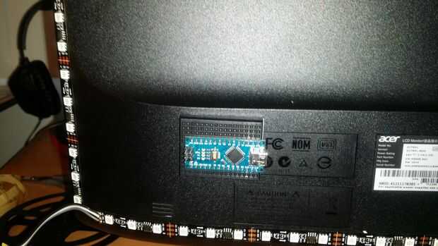 Una vez que las tiras estén en su lugar puede montar la placa con el Arduino Nano a la parte posterior del monitor. Asegúrese de montarlo en un lugar conveniente, ya que necesita poder conectar el cable USB al ordenador más adelante en este proyecto.