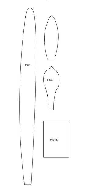 preparación-Arrugar papel: púrpura, verde, amarillo, negro-Zinc-Cera verde-Pinzas tijeras, pistola de pegamento-disparosPaso 1: Pétalo, hoja, pistilo, ovario forma de impresión en papel blanco y cortar saparately.Cortar papel púrpura en tres pequeños