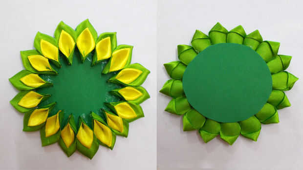 Fijar los pétalos amarillo dentro de los verdes y pegarlos con una base circular de la hoja de la espuma.