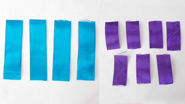 Cinta azul y morado corte piezas mide 9 cm y 5 cm de largo.