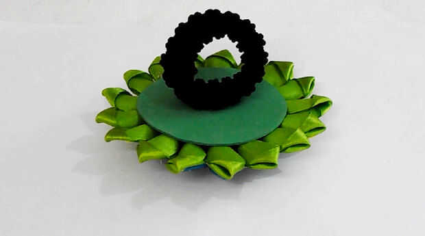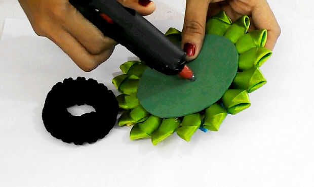 Tome un arco del pelo y pégalo a la base de la flor con pistola encoladora