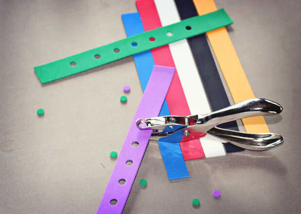 Perfore orificios a lo largo de la longitud de la espuma de la tira, utilizando una perforadora de papel regular. Dejar un poco de espacio en los extremos para el cierre con broche. Si usted no va a utilizar un complemento (o velcro o pegamento) para el cierre, sin embargo, puede perforar hasta los confines y cerrar la pulsera empujando un encanto a través de ambos agujeros al mismo tiempo.