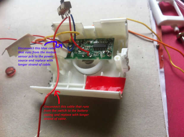 Claramente la etiqueta y luego desconecte los cables positivos y negativos conectados al compartimento de la batería / alimentación de corriente en el circuito del sensor de movimiento y volver a soldar la longitud deseada de claramente marcados + y -a un nuevo caso.